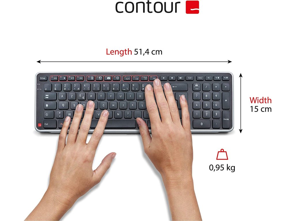 Prémiová a drátová kompaktní ergonomická klávesnice Contour se přizpůsobí výškovému nastavení. Klávesnice má systém pro tiché úhozy s hmatovou zpětnou vazbou. Klávesnice disponuje minimálním rozměrem mezi klávesnicí a Rollermouse Red, aby myš a klávesnice byly pro pravou nebo levou rukou v co nejoptimálnější a nejbližší pozici, proto byla takto vyrobena. Klávesnice má minimální přední hranu, aby s Rollermouse byla v optimálním dosahu vašich prstů, což oceníte při ovládání.