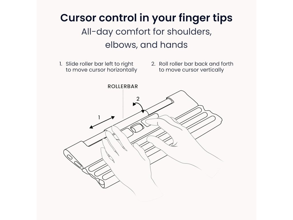 Všechny produkty RollerMouse se při ovládání kurzoru na obrazovce spoléhají na patentovaný Rollerbar. Tento nový způsob ovládání kurzoru válečkové myši vám umožní plynulou práci s prsty a palci a je snadno použitelný oboustranně. Rollerbar u válečkové myši nevyžaduje uchopení a stisknutí ruční myši, což zvyšuje vaše pohodlí a radikálně snižuje riziko vzniku poranění souvisejícího se standardní myší.