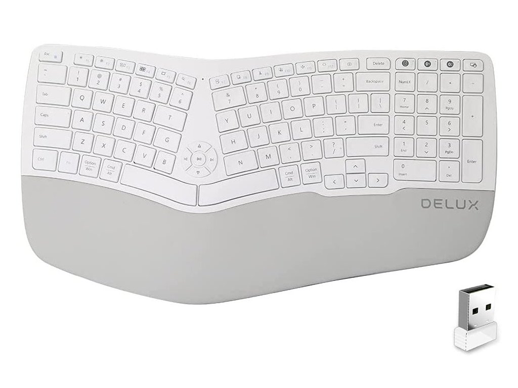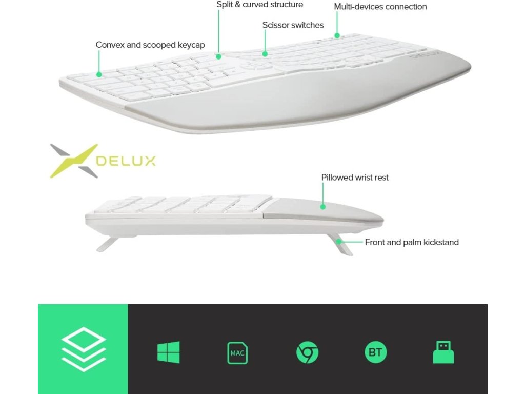 Specifikace: bezdrátová + Bluetooth ergonomická zařivená klávesnice Delux bílá, model GM902W.