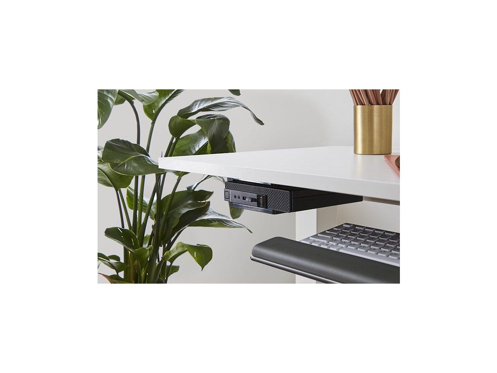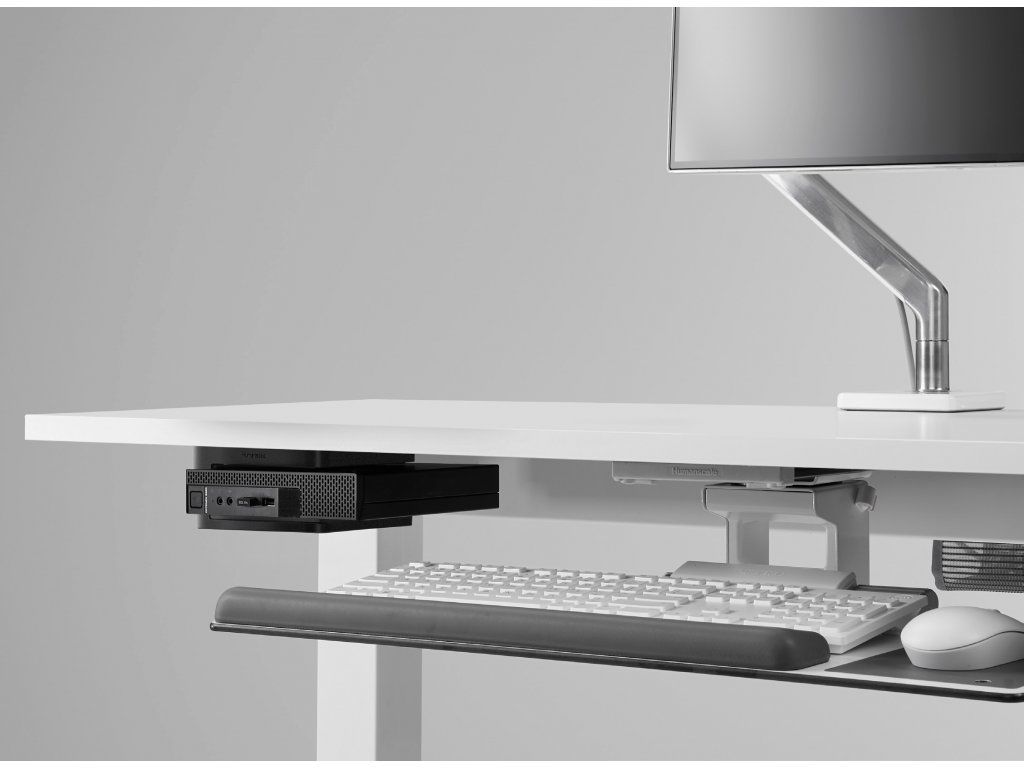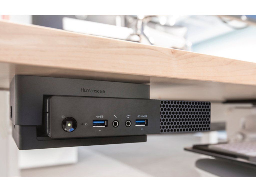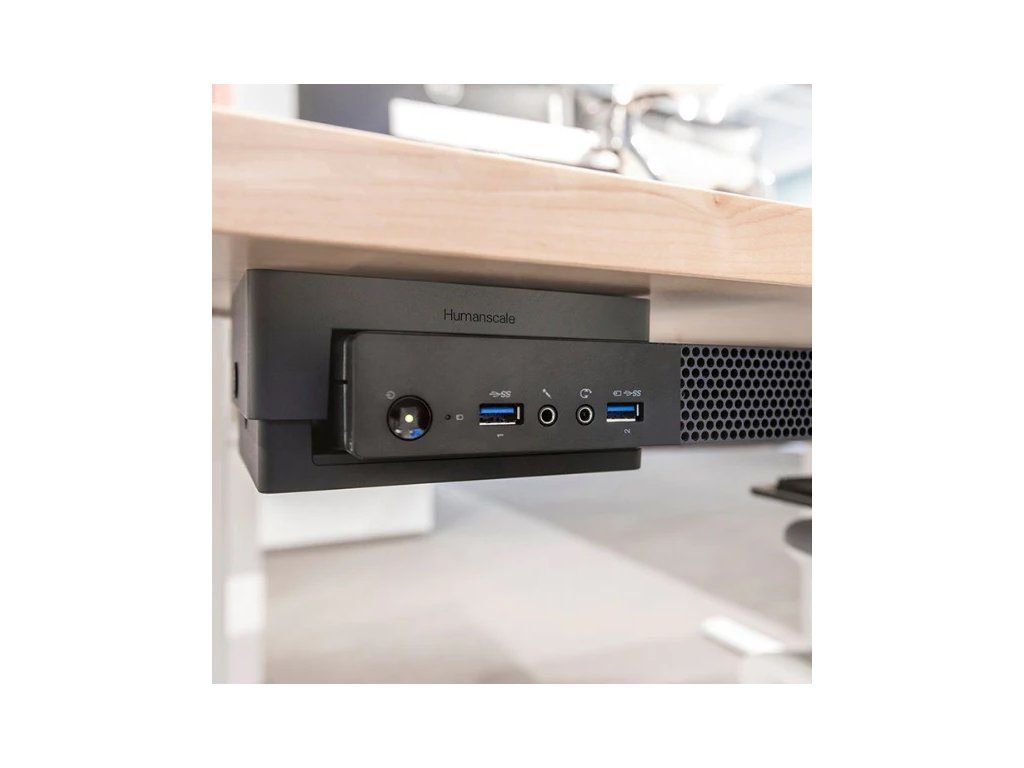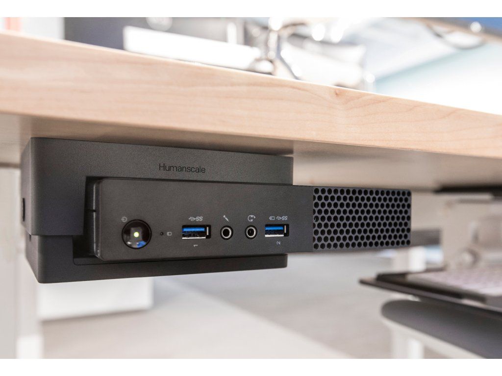 Instalace nikdy nebyla jednodušší. Držák tenké skříňky počítače lze namontovat pod jakoukoliv pracovní plochu nebo na podpěrný nosník stolů Humanscale Float.