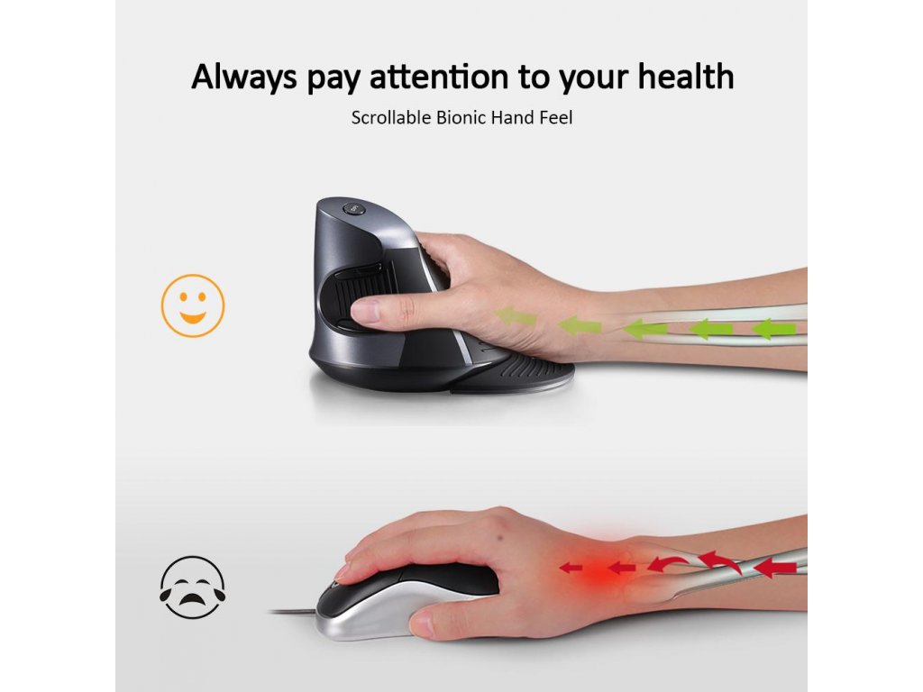 The wireless mouse M618W Delux has 6 buttons including a scroll wheel. The left and right mouse buttons are controlled by the index and middle fingers. The scroll wheel can be used for navigation and can be controlled with the index or middle finger. The thumb controls the forward and back buttons and a button for additional DPI settings. M618 Delux keeps the arm in a natural position and minimizes the risk of developing consequences from long-term use of the computer mouse.