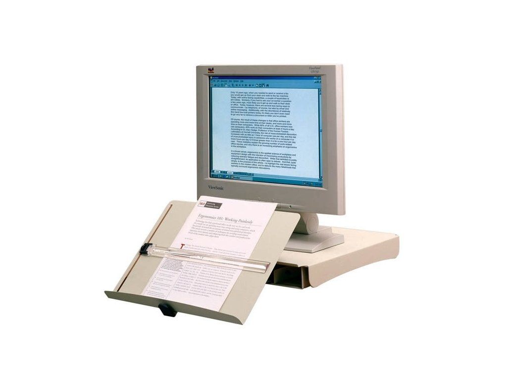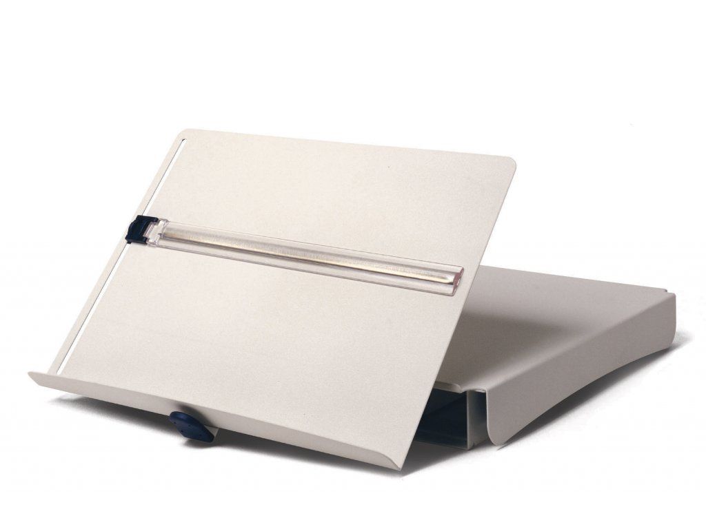 The document stand reduces health hazards by adopting the correct body position when working with documents, reduces strain and strain on the neck, back and shoulders and increases performance when you are not working with documents. You simply insert your own holder into the body of the stand, the sliding ruler secures the document and marks the line you are currently working with.