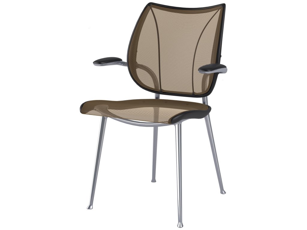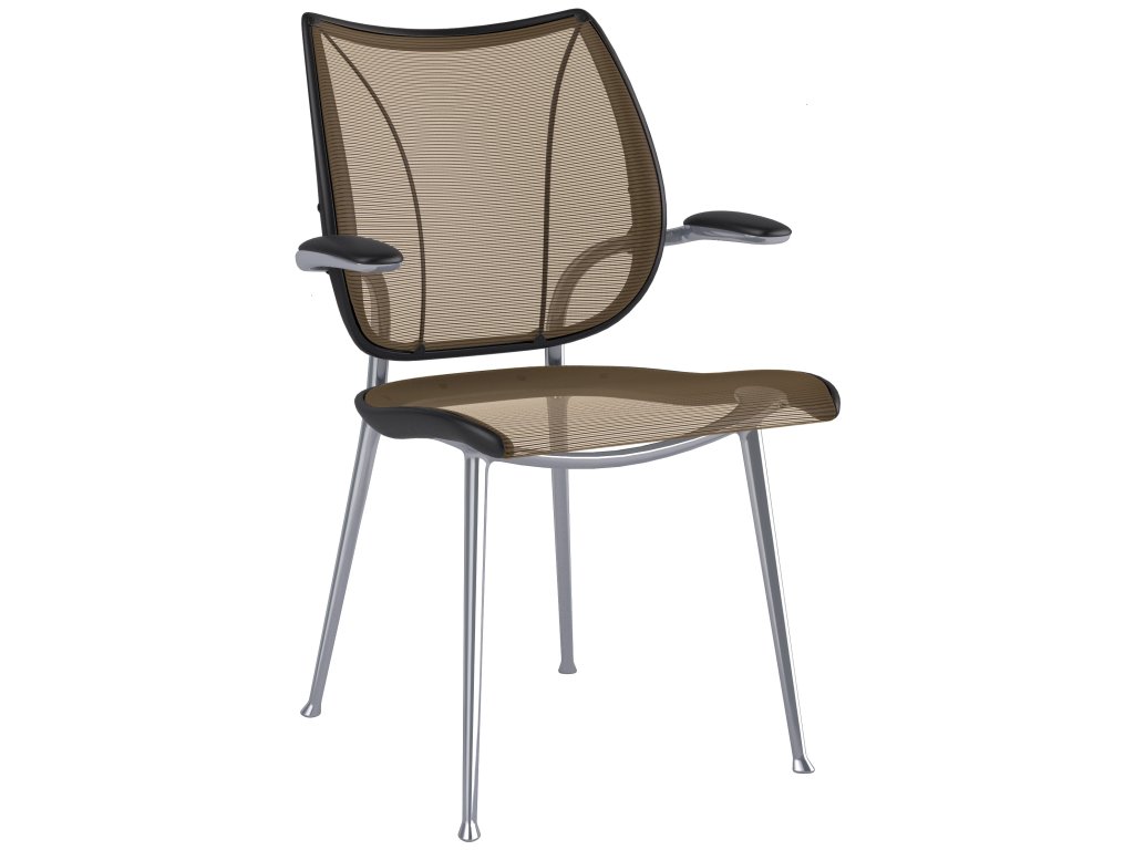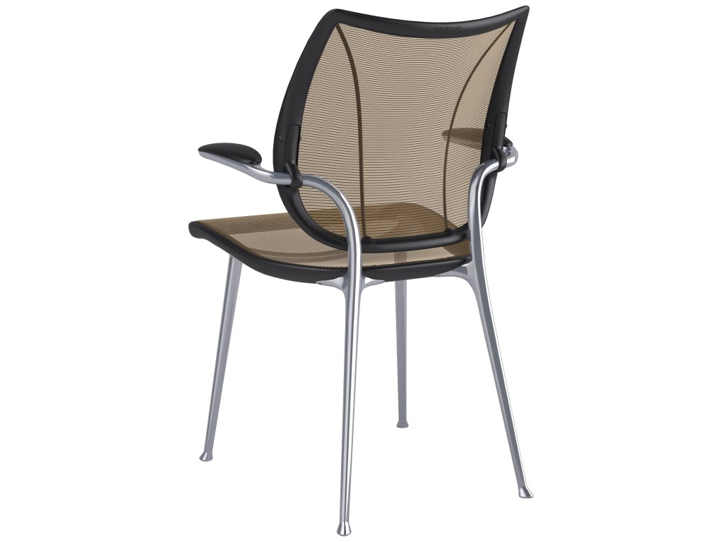 The Humanscale Liberty chair has the following specifications: conference chair, polished aluminum frame, solid black Duron armrests, black backrest and seat frame, backrest and seat in Monofilament Stripe 81 Amber mesh, code L406AM81M81.