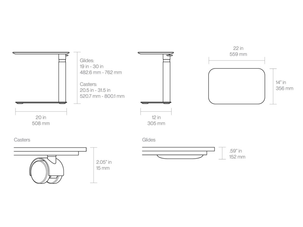 - height range with glides: 482.6 mm - 762 mm (from floor to top)