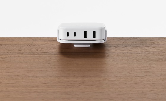 NeatCharge conveniently attaches under the desk, creating a work surface that is easy to clean and avoids visual clutter.