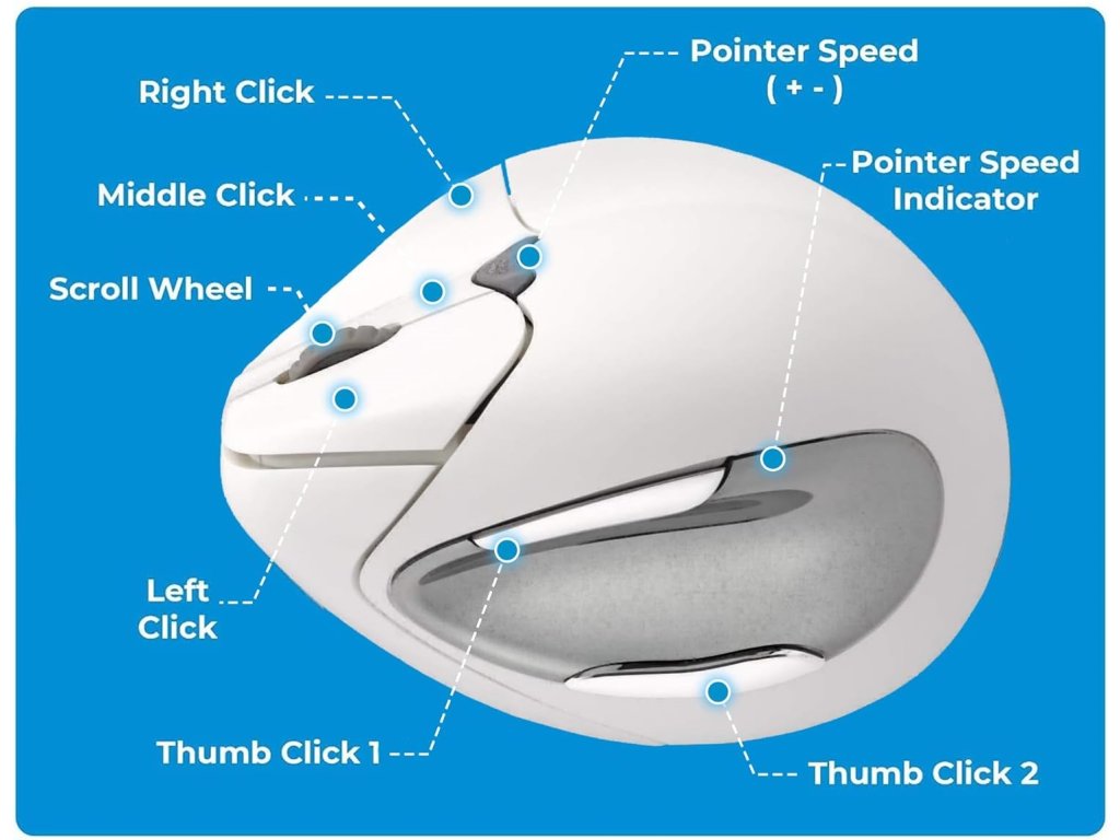 Opěrka palce byla u Evoluent Vertikal Mouse 4 upravena tak, aby poskytovala ještě větší pohodlí oproti předchozím verzím. Nové spodní palcové tlačítko poskytuje výrazně rozšířenou funkčnost při použití s přiloženým ovladačem.
