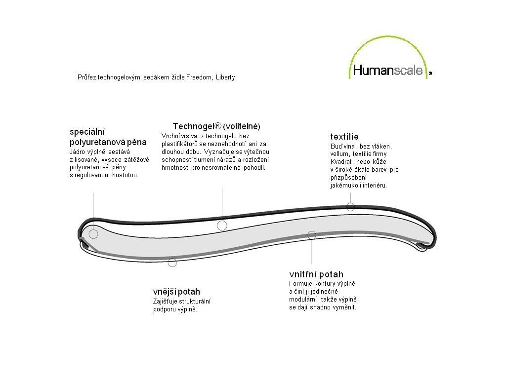 Židle může být vyplněná gelovým nebo polyuretanovým sedákem podle konkrétní specifikace. Technogel® je materiál vysoce ergonomický a tvarovatelný. Díky tomu, že se jedná o hustou kapalinu, jde o materiál imunní vůči prosezení. Díky těmto vlastnostem a celkovým parametrům materiálu je gel velice oblíbený a zákazníci jej požadují. Kostra židle je z oceli/slitiny, takže je prakticky nezničitelná. V nabídce je několik možností područek, Duronové, nebo v látce potahu a dokonce židle Freedom může být bez jakýchkoliv područek. Židle je dodávána v celku, není tak třeba žádná montáž.
