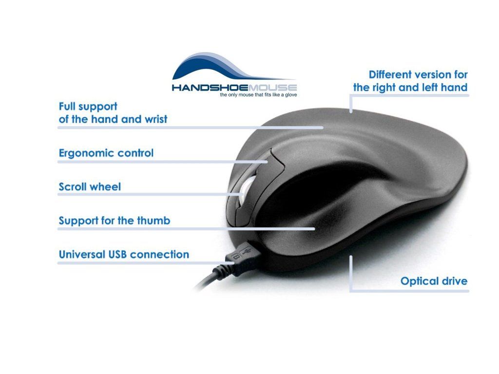 Drátová pravoruká myš HandShoe Mouse má 3 tlačítka včetně rolovacího kolečka. Levé a pravé tlačítko myši jsou ovládány ukazováčkem a prostředníčkem. Rolovací kolečko lze použít pro navigaci a může být ovládáno ukazováčkem nebo prostředníčkem. Ergonomická myš ,,HandShoe Mouse" udržuje paži v přirozené pozici a minimalizuje riziko vzniku následků z dlouhodobého používání počítačové myši.