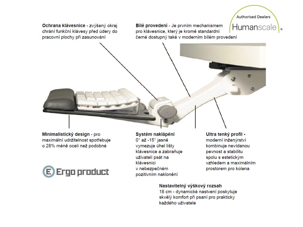 Humanscale zaujímá vedoucí pozici na trhu klávesnicových mechanismů zejména díky vyspělé technologii, různorodosti oceněných mechanismů a nepřeberným možnostem nastavení.