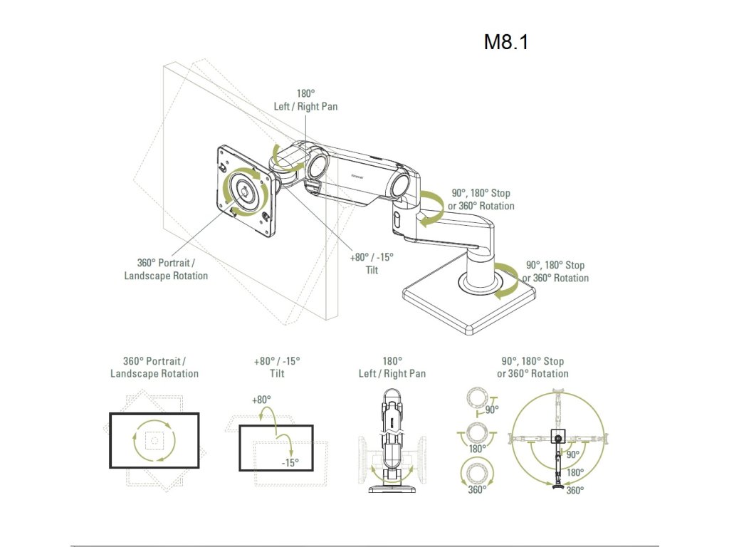 M8.1 podporuje lepší pracovní polohu, vytváří více využitelného prostoru na pracovní ploše a pomáhá udržovat pracoviště přehledné. Nabízí rychlou, jednoduchou instalaci a špičkovou flexibilitu díky rychloupínacím kloubům, které se okamžitě spojí a zajistí bezpečné a robustní připojení.