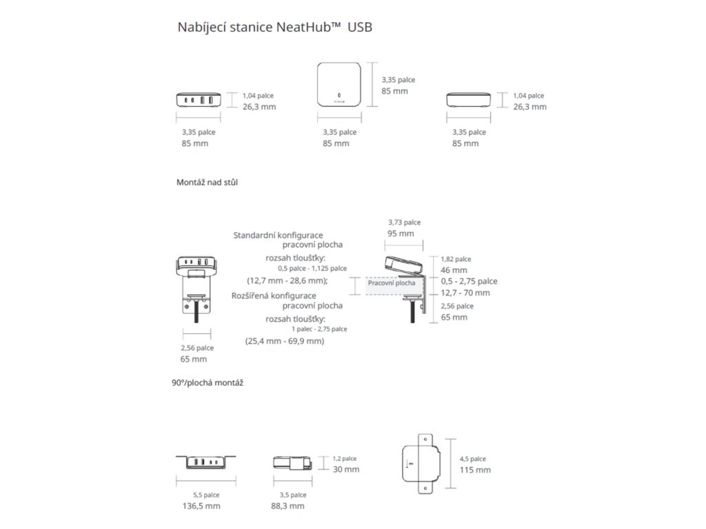 Díky minimálnímu rozměru se NeatHub snadno upevní na většinu povrchů, včetně stolů, konferenčních stolků a dalších povrchů.