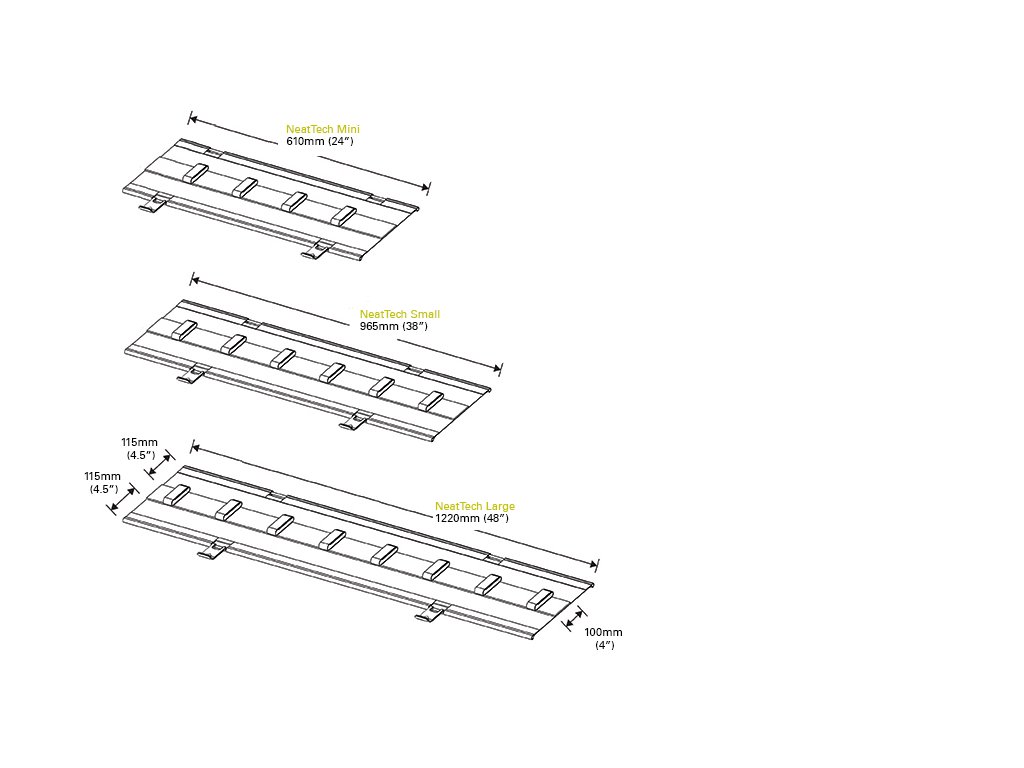 Kabelové organizéry NeatTech pro uložení kabeláže od společnosti Humanscale byly vytvořeny s cílem vyřešit problémy s nepořádkem v kabelech, minimalizovat nebezpečí v pracovním prostoru a vytvořit pohodlnou a přehlednou pracovní plochu. Tyto kabelové organizéry lze nainstalovat pro pracovní stoly ve třech možných délkových konfiguracích dle požadavku uživatele a každého jedinečného pracovního prostředí. Ideální pro kabiny, výukové a konferenční místnosti, provozní místnosti a soukromé uzavřené i otevřené kanceláře. Pro optimální využití ukládejte do kabelového organizéru vašeho pracovního stolu potřebné kabely, rozdvojky atd.