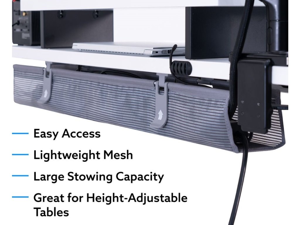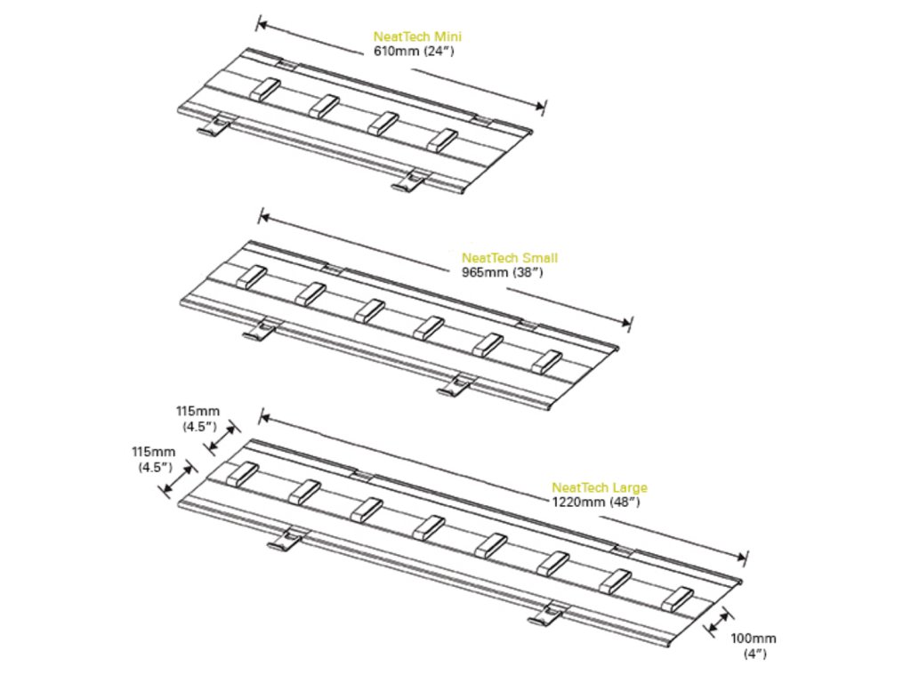 Kabelové organizéry NeatTech pro uložení kabeláže od společnosti Humanscale byly vytvořeny s cílem vyřešit problémy s nepořádkem v kabelech, minimalizovat nebezpečí v pracovním prostoru a vytvořit pohodlnou a přehlednou pracovní plochu. Tyto kabelové organizéry lze nainstalovat pro pracovní stoly ve třech možných délkových konfiguracích dle požadavku uživatele a každého jedinečného pracovního prostředí. Ideální pro kabiny, výukové a konferenční místnosti, provozní místnosti a soukromé uzavřené i otevřené kanceláře. Pro optimální využití ukládejte do kabelového organizéru vašeho pracovního stolu potřebné kabely, rozdvojky atd.
