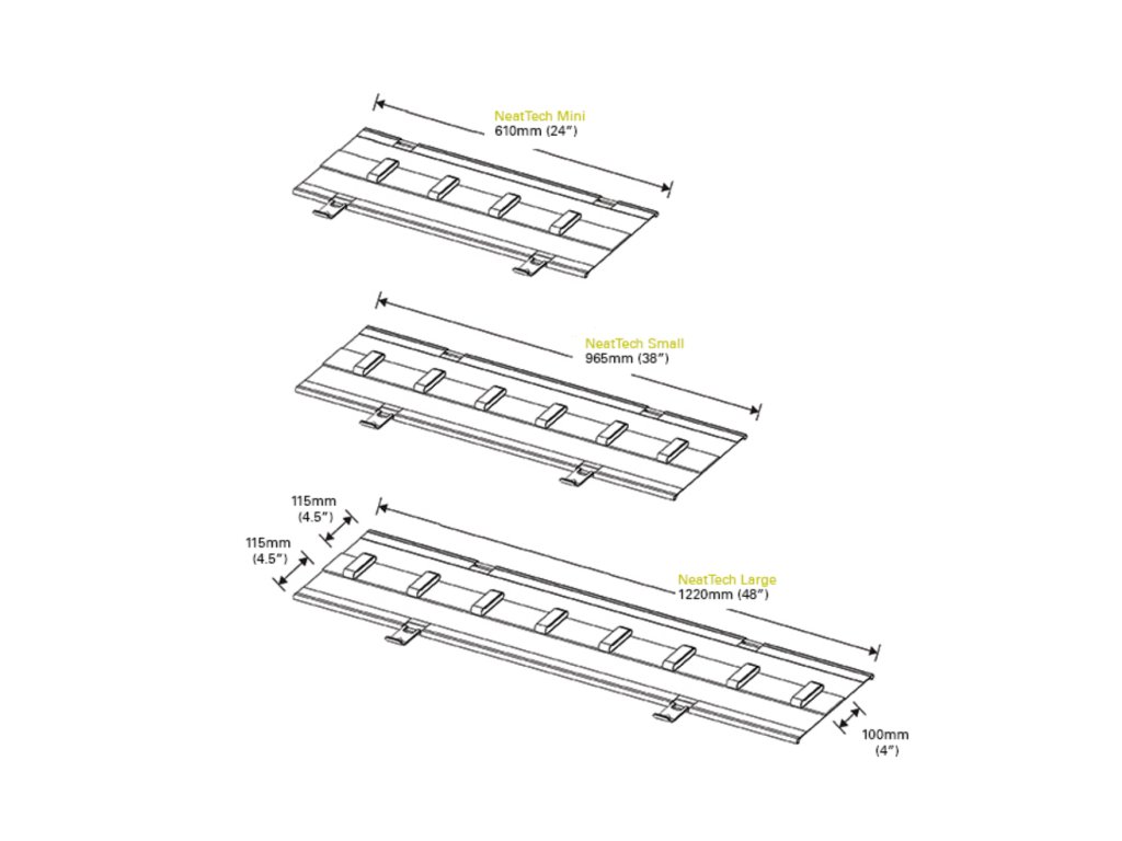 Kabelové organizéry NeatTech pro uložení kabeláže od společnosti Humanscale byly vytvořeny s cílem vyřešit problémy s nepořádkem v kabelech, minimalizovat nebezpečí v pracovním prostoru a vytvořit pohodlnou a přehlednou pracovní plochu. Tyto kabelové organizéry lze nainstalovat pro pracovní stoly ve třech možných délkových konfiguracích dle požadavku uživatele a každého jedinečného pracovního prostředí. Ideální pro kabiny, výukové a konferenční místnosti, provozní místnosti a soukromé uzavřené i otevřené kanceláře. Pro optimální využití ukládejte do kabelového organizéru vašeho pracovního stolu potřebné kabely, rozdvojky atd.