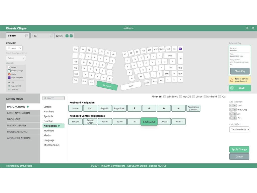 Díky novému zařízení Kinesis Clique Programming Engine zákaznické programování vaší klávesnice nebylo nikdy jednodušší. Stačí připojit mWave ke stolnímu počítači pomocí USB kabelu a spustit Clique pomocí prohlížeče Chrome nebo Edge! Klávesnici můžete přeprogramovat v reálném čase a uložit změny přímo na klávesnici kliknutím na tlačítko a.