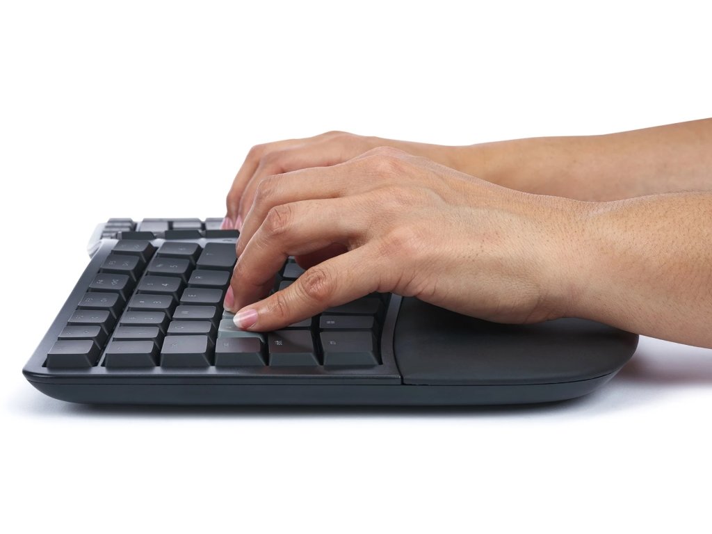 - Integrovaná opěrka dlaní: Sametově hladká, omyvatelná opěrka dlaně podporuje neutrální polohu při psaní a snižuje natahování zápěstí.