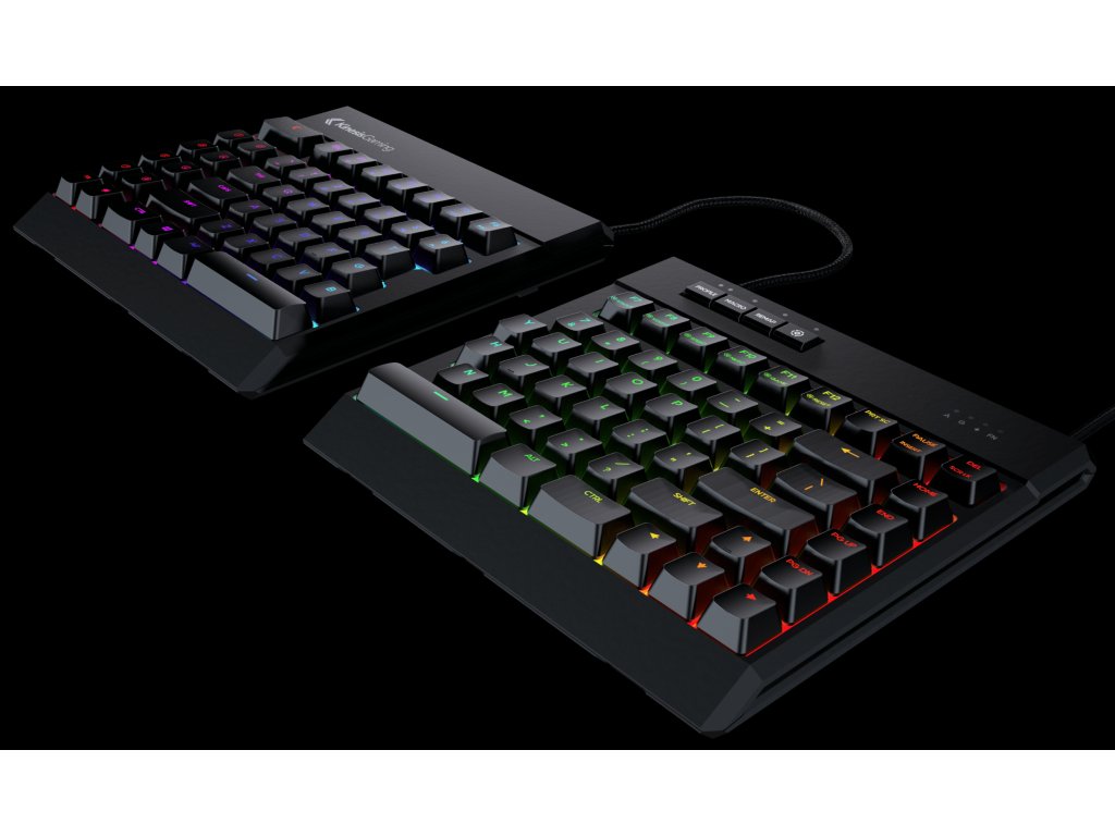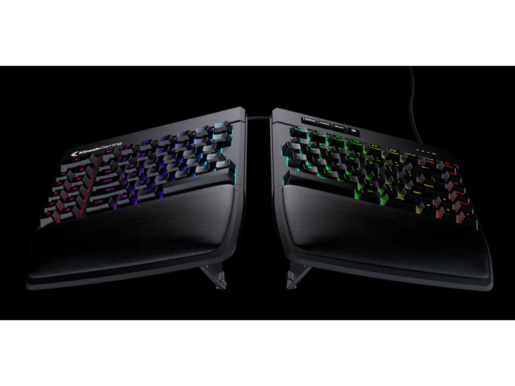 Dva klávesové moduly jsou propojeny 20palcovým propojovacím kabelem, který lze upravit tak, aby vyhovoval vašim preferencím a typu postavy. Základní konfigurace umožňuje rozdělení až 30 cm. Pokud potřebujete větší rozdělení, jednoduše sejměte kryt kabelového prostoru umístěný na zadní straně levého klávesového modulu a natáhněte další uložený kabel, dokud nenajdete požadovanou šířku.