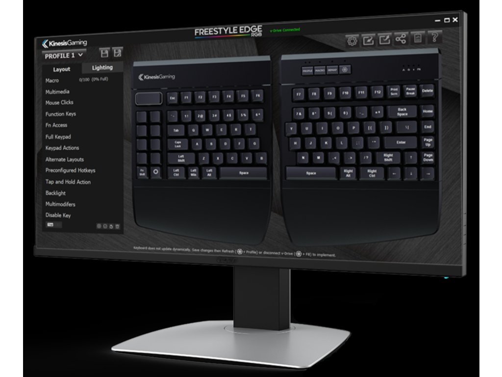 Preferujte grafické rozhraní pro přizpůsobení rozvržení, osvětlení a nastavení Freestyle Edge RGB+. Jednoduše si stáhněte verzi pro Windows nebo Mac do počítače a spusťte ji z plochy. Chcete-li začít, použijte zkratku pro připojení "v-Drive" klávesnice.