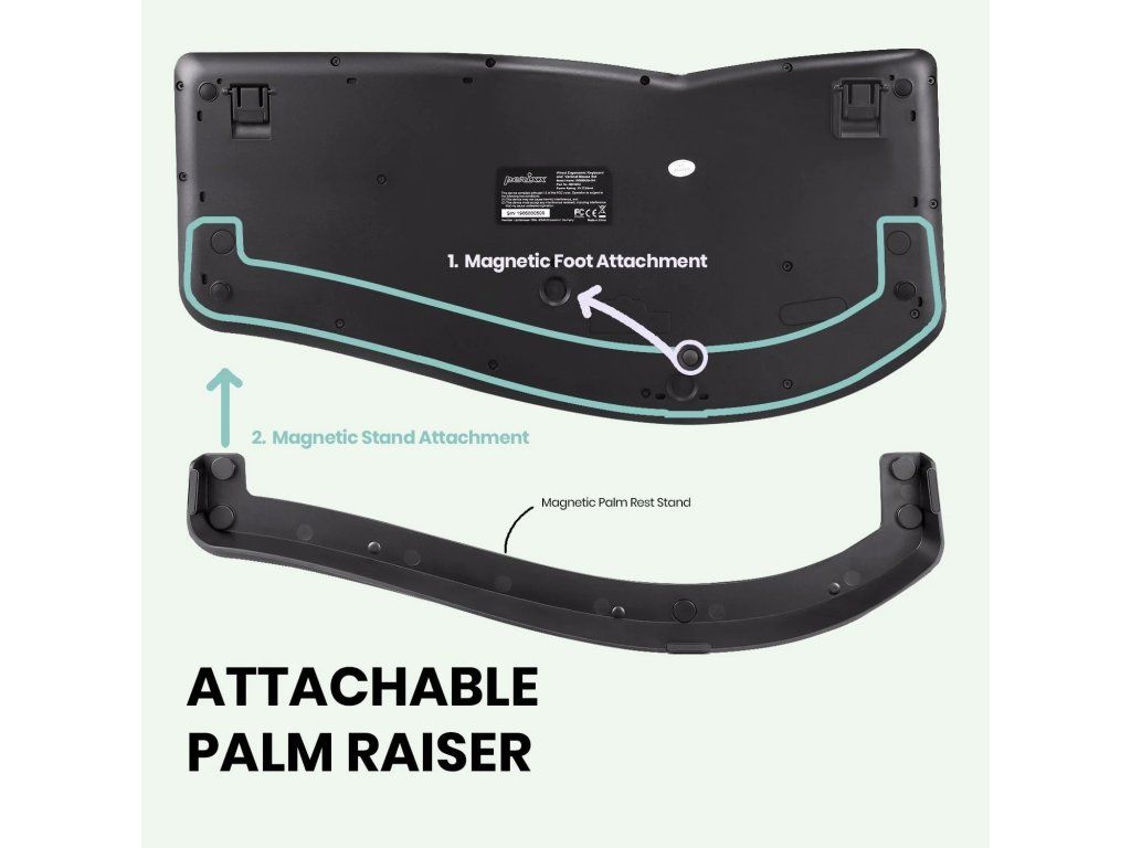 Zakřivená geometrie kláves s přirozeně klenutým tvarem a integrovaný nastavitelný stojánek pro opěrku dlaní, který podporuje neutrální polohu zápěstí na tenkém designu s nízkoprofilovými klávesami, výška 39 mm.