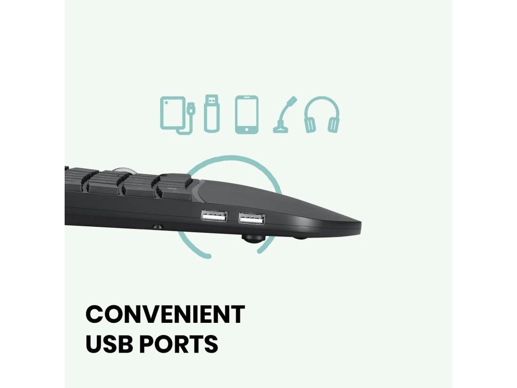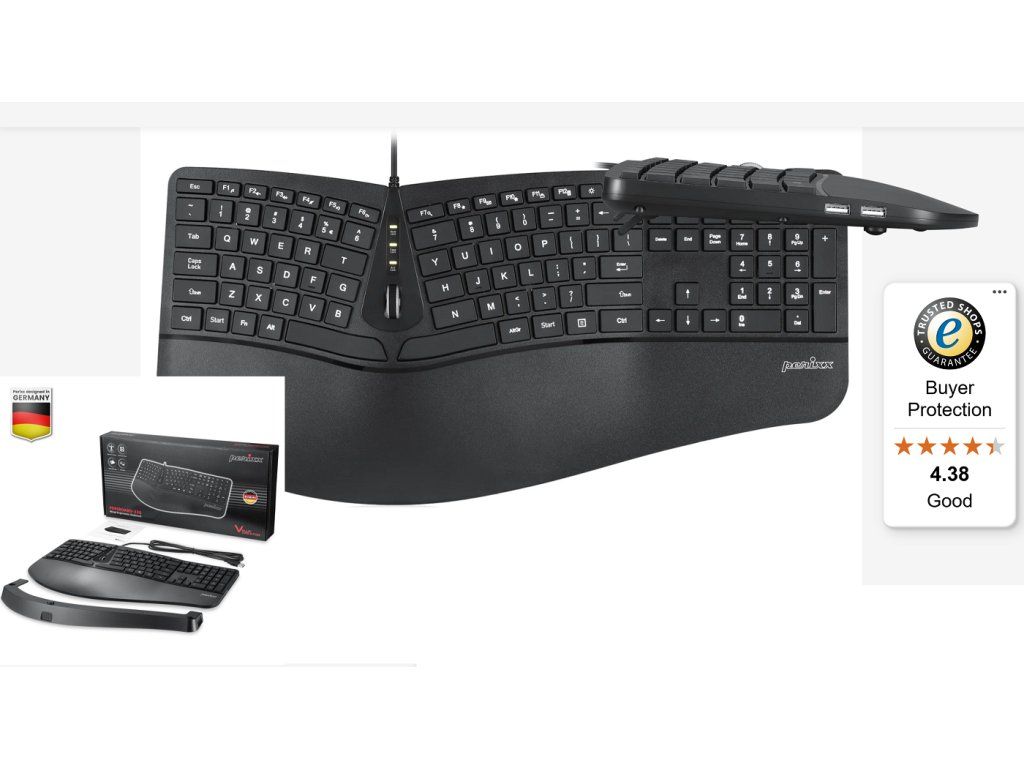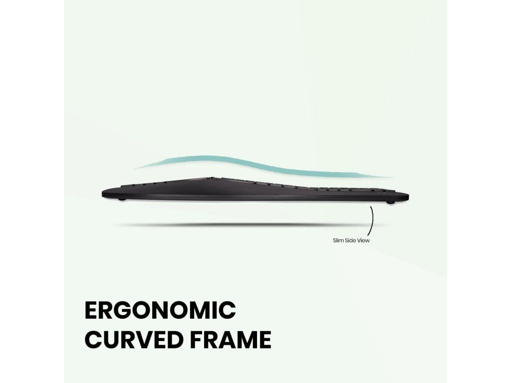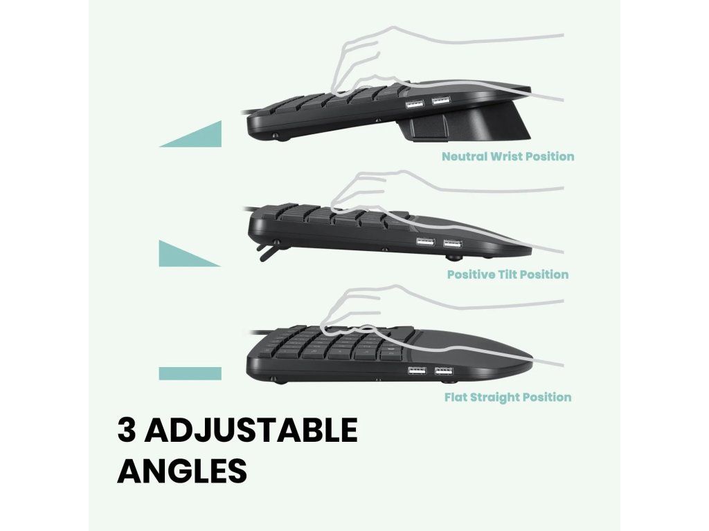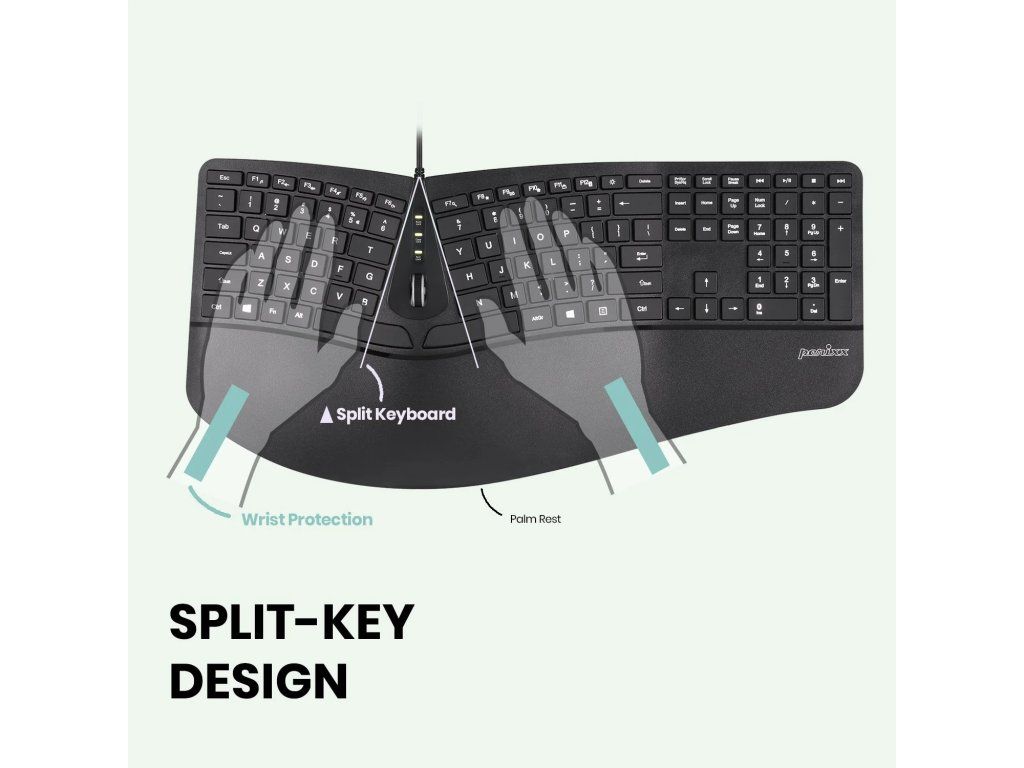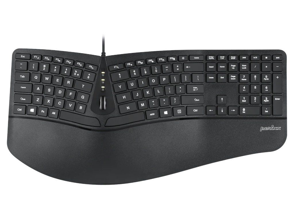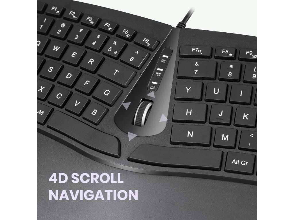 Klávesnice plné velikosti se zakřiveným designem, která rozděluje klávesy do několika skupin, aby se optimalizovalo umístění levé a pravé ruky a omezilo se ohýbání zápěstí směrem ven při psaní. Udržuje tak ruce a předloktí v uvolněné a přirozenější poloze.