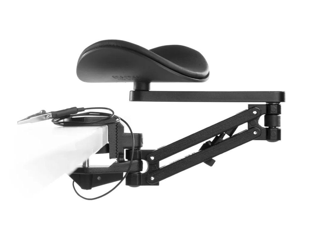 Specyfikacje: Ergorest podpórka pod przedramię ESD z zabezpieczeniem przed wyładowaniami elektrostatycznymi, czarny metal, czarna skóra, zewnętrzny obwód ramienia 125 mm, długość podpórki pod przedramię 130 mm, rozstaw szczęk 15-43 mm, model 338023.