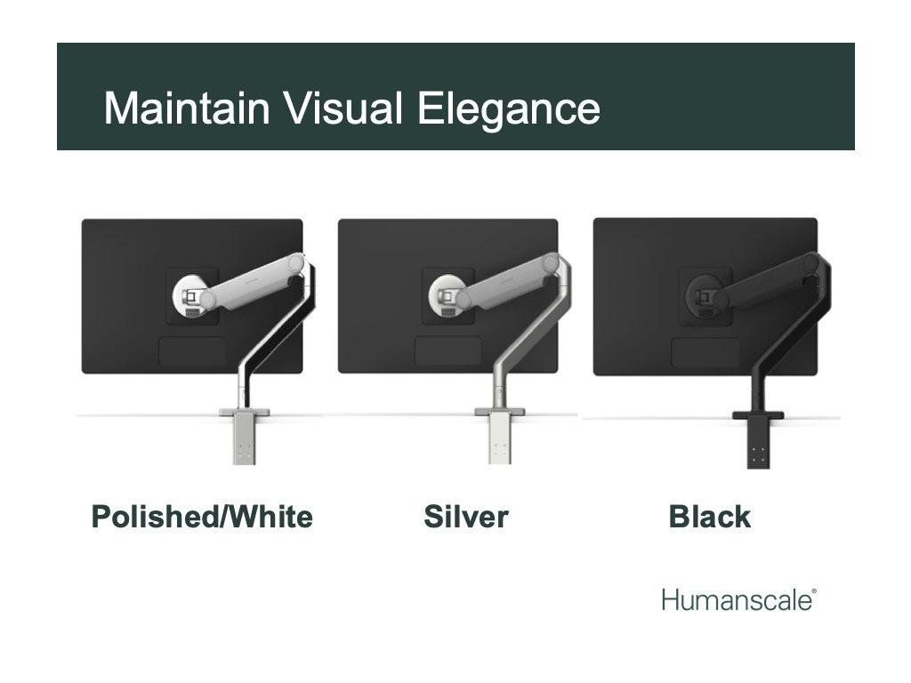 Studio projektowe Humanscale udoskonaliło wygląd i funkcjonalność naszej gamy ramion do monitorów, aby w jak największym stopniu wspierać dzisiejszy sposób pracy. Dzięki zastosowaniu lepszej technologii i coraz bardziej aktywnej siły roboczej nasze ramiona poprawiają komfort korzystania z komputera i zwiększają wydajność pracy w miejscu pracy.