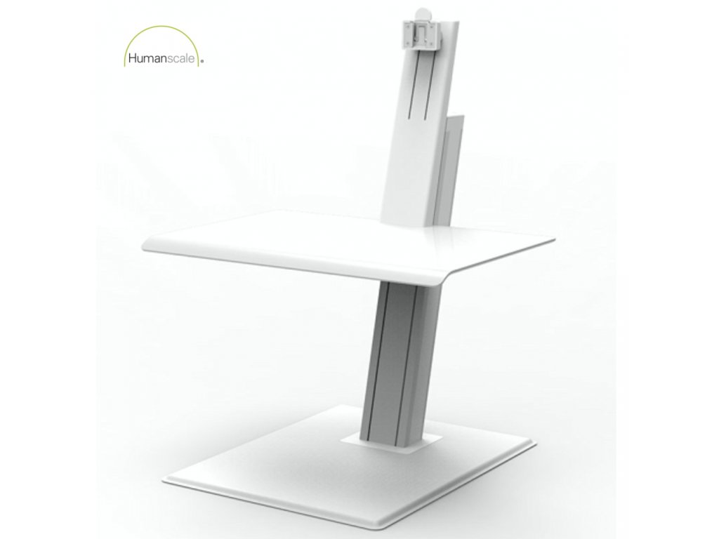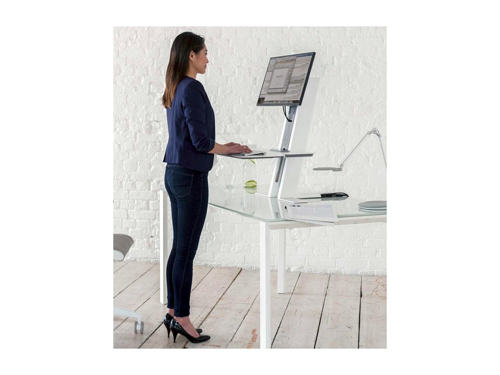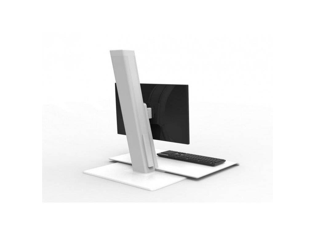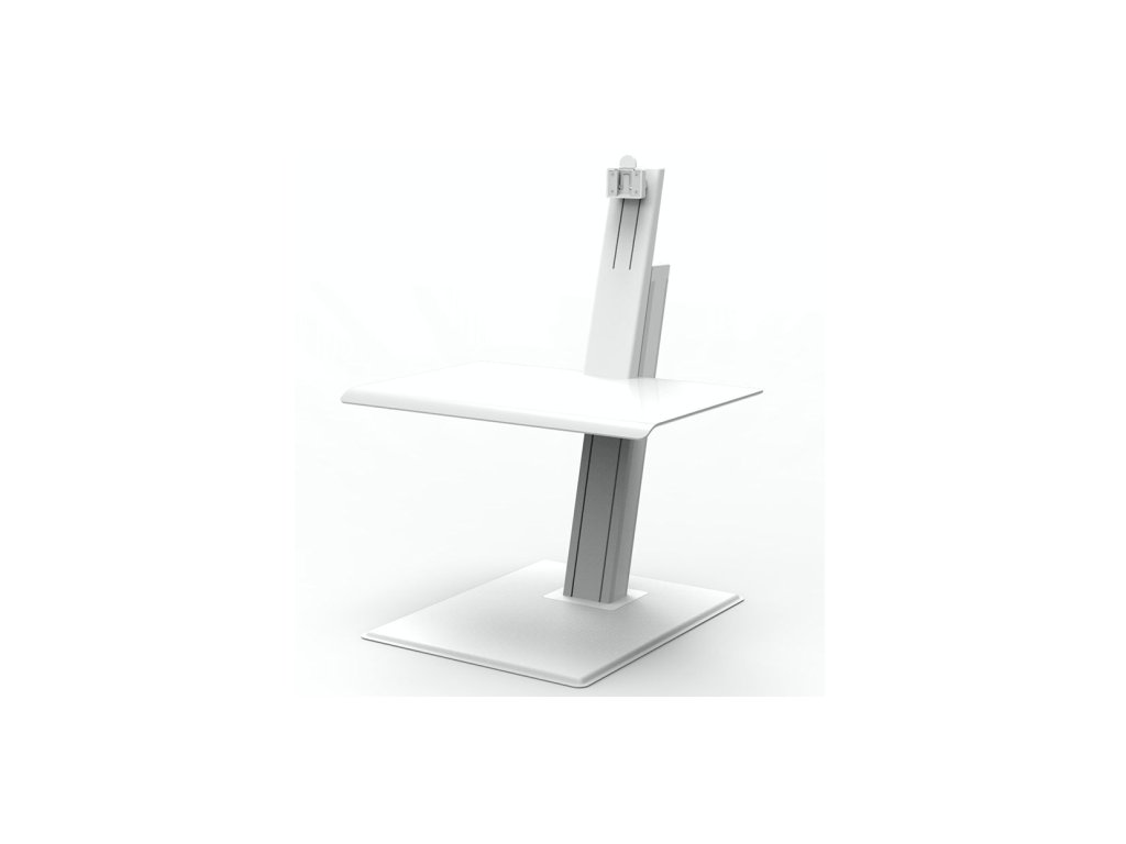 Specyfikacje: QuickStand ECO Model QSEWS w skali ludzkiej, na jeden monitor, blat o wymiarach 483 x 711 mm, kolor biały.
