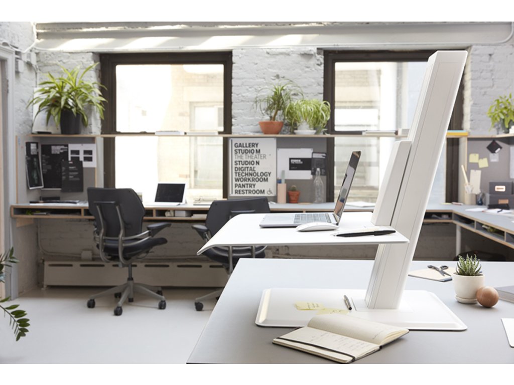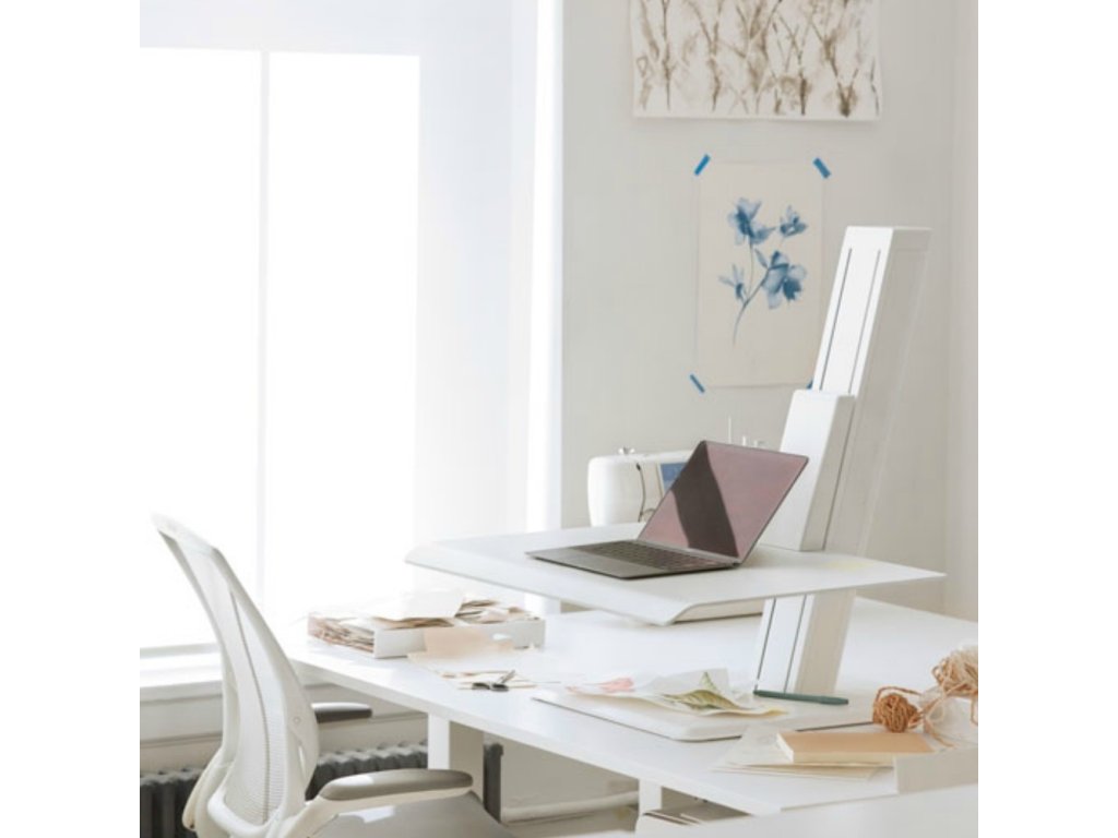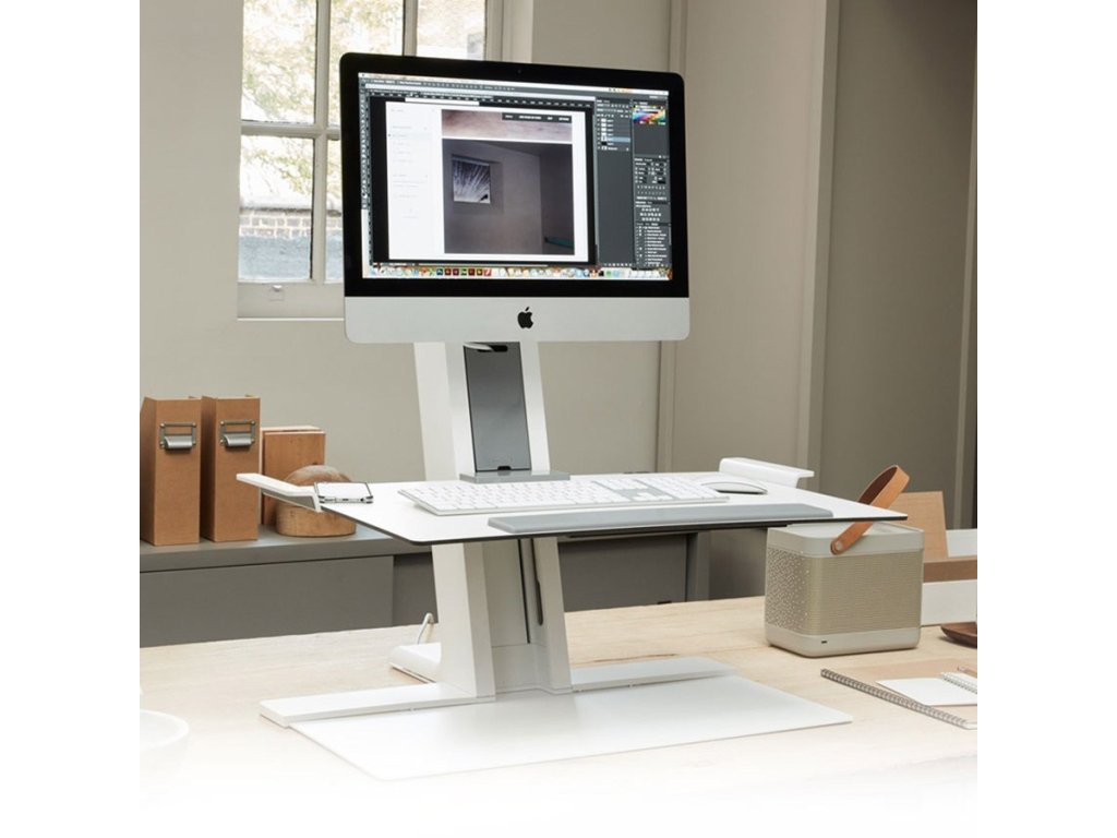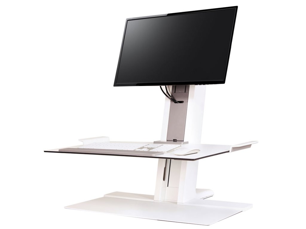 Specyfikacje: QuickStand ECO Model QSEWS w skali ludzkiej, na jeden monitor, blat o wymiarach 483 x 711 mm, kolor biały.