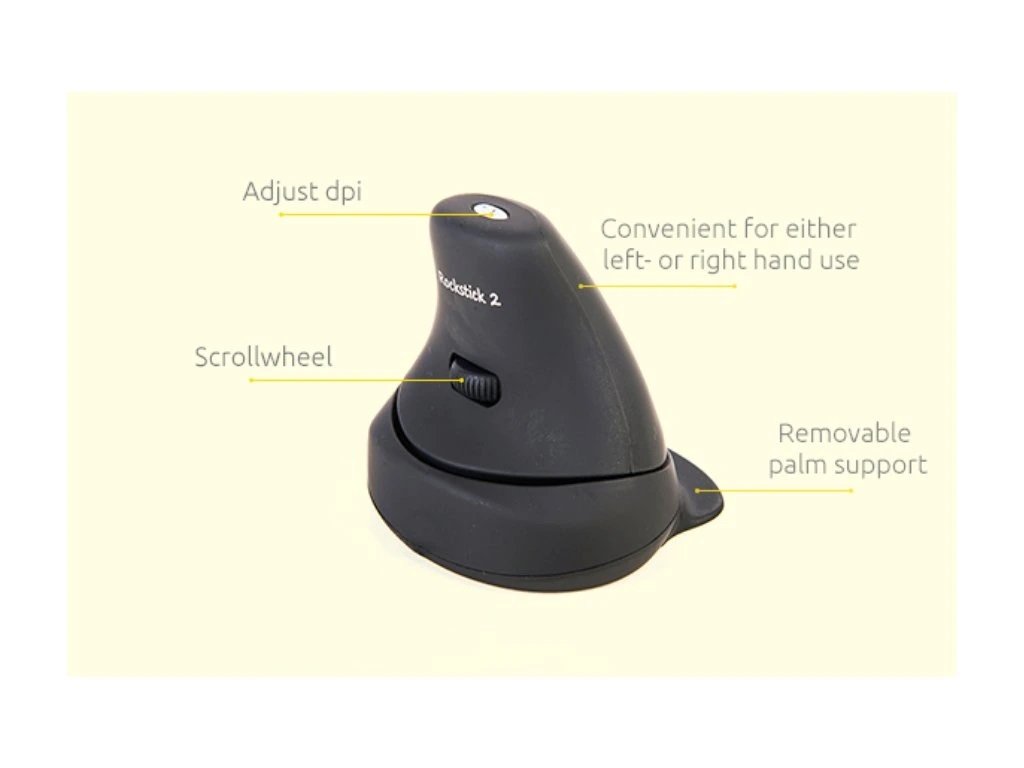 Vertikální bezdrátová obouruká myš myš Rὅckstick má pouze 2 tlačítka včetně rolovacího kolečka. Rolovací kolečko lze použít pouze palcem pravé nebo levé ruky. Kliknutí ukazováčkem nebo prostředníček nahrazuje pohyb celé myši vpravo nebo vlevo. Ovládání rolovacího kolečka prsty není vhodné z důvodu poškození šlach a vazů dané ruky, proto se rolovací kolečko ovládá pouze palcem.