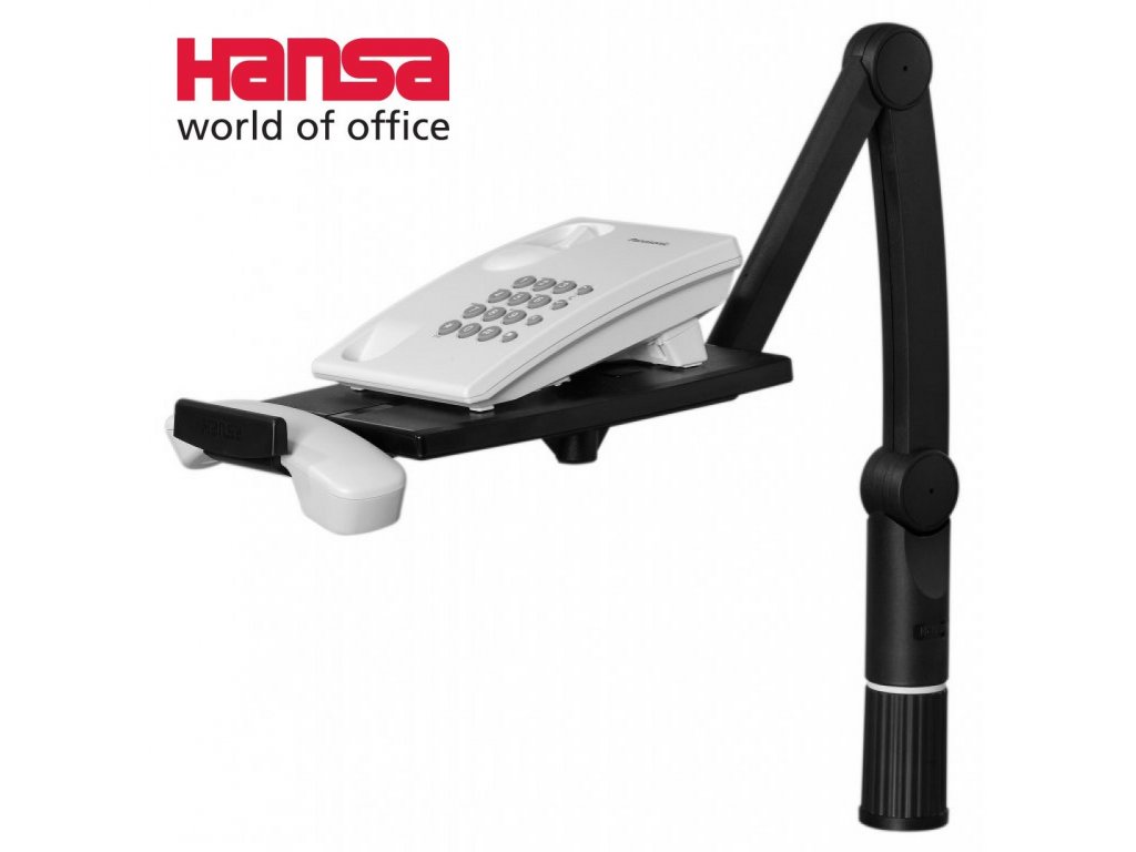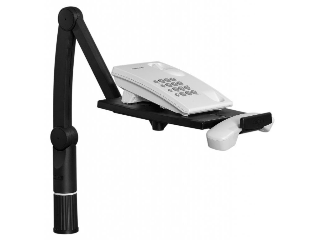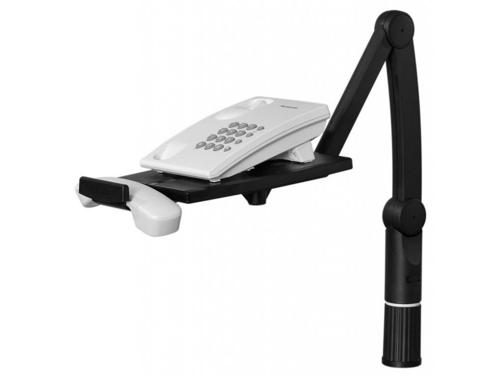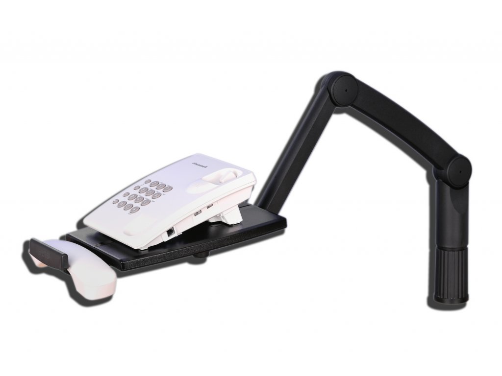 Stojánek pod telefon kloubový polohovatelný a otáčí se o 360°. V základní poloze dosahuje celkové výšky 480 mm, výška desky pod telefon je 250 mm nad stolem a sahá do vzdálenosti 530 mm (vždy vč. rukojeti). Posunutím do mezi polohy se vysune do vzdálenosti 710 mm a do výšky 130 mm. V krajní poloze se deska pod telefon pokládá až na stůl do vzdálenosti 750 mm. Tuto desku s rozměry 170 mm x 260 mm můžete při sestavování natočit o 90°. Pokud máte telefon větších rozměrů, doporučujeme její rozšíření vloženou deskou - šedou. Upevnění stojanu se provádí pomocí svěrky, která je vždy součástí výrobku, k desce stolu v rozmezí 20-72 mm. Dalším možným způsobem upevnění stojanu je: upevnění vruty, které nejsou součástí balení, je nutno přiobjednat.