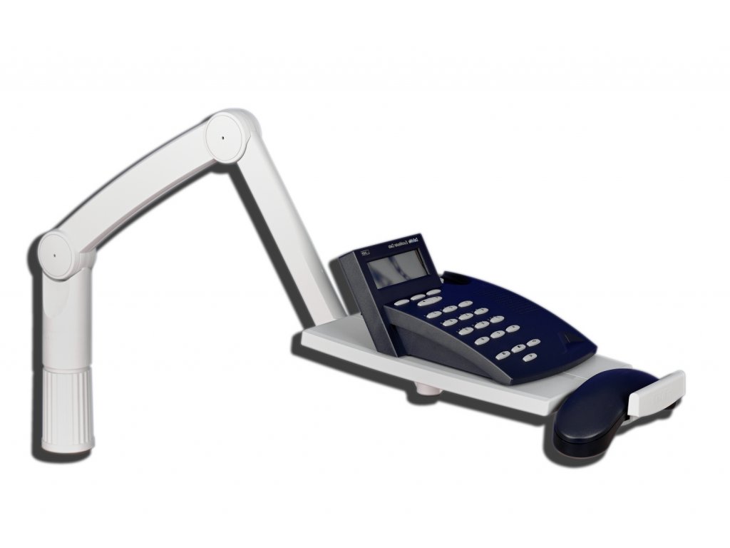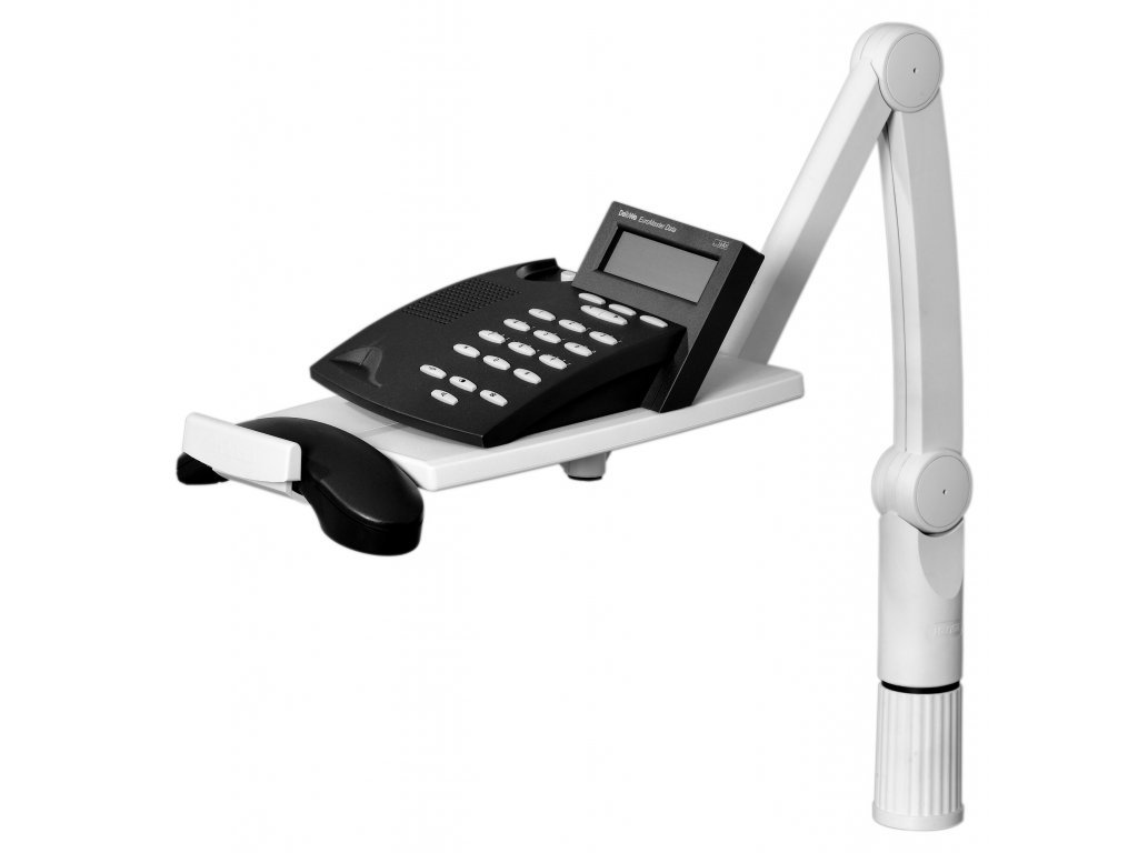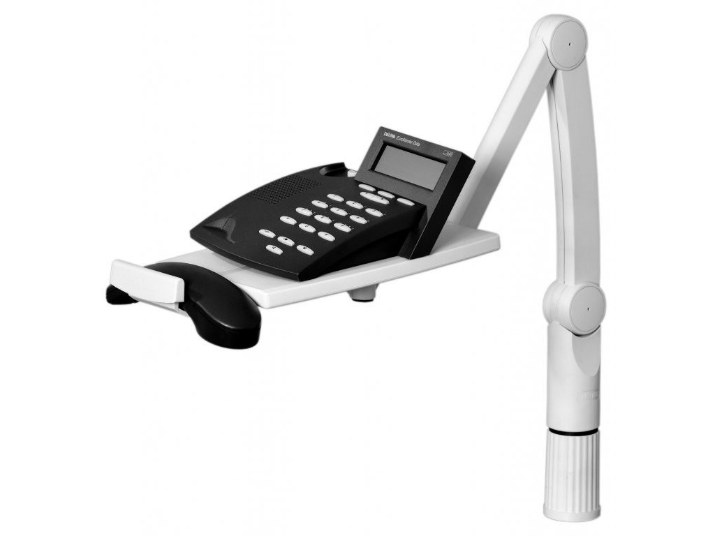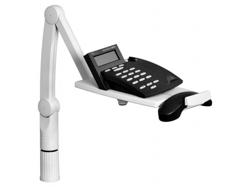 Specifikace: otočný telefonní stojánek kloubový, polohovatelný s dvěma články, upevnění svěrkou v šedé barvě model 000900.