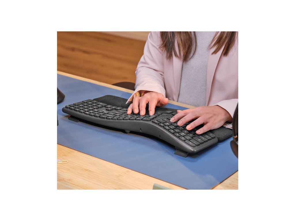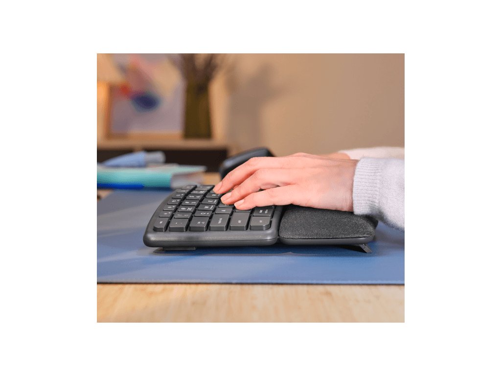 Ať už sedíte nebo stojíte, užívejte si celodenní pohodlí s polstrovanou opěrkou rukou a nastavitelnými výklopnými nožičkami klávesnice Keyra. Tuto klávesnici si zamiluje i vaše okolí – tiché klávesy z ní činí ideálního společníka pro tiché pracovní prostředí a zajišťují, že nebudete rušen vy a ani ostatní kolem vás.